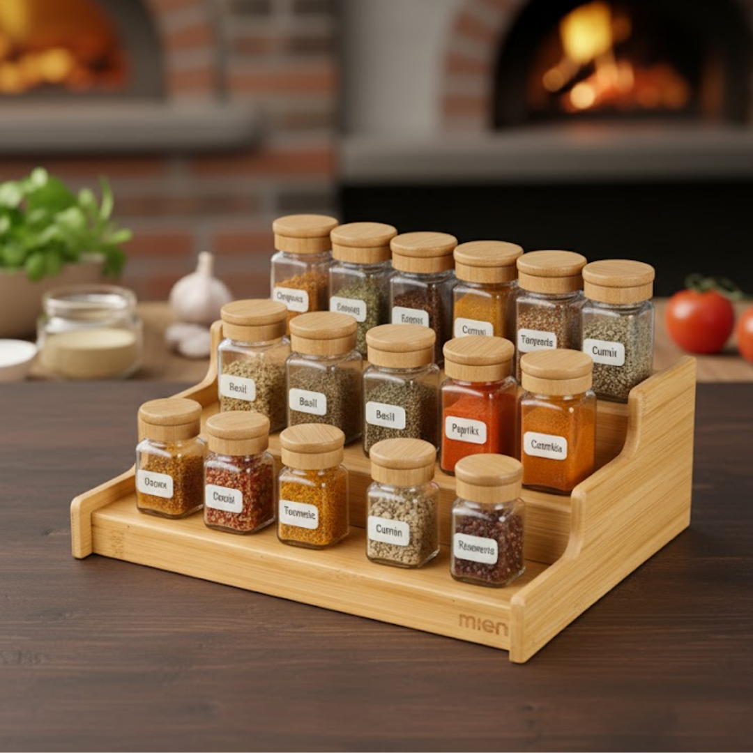 Baharatlarınızı görünür ve ulaşılabilir kılın! Doğal bambudan üretilmiş bu kademeli stand, baharatlıkları, konserveleri ve küçük kavanozları düzenlemek için idealdir. Dolap içinde ve tezgah üstünde maksimum verim sağlar.